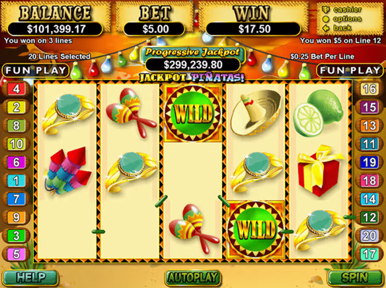 Jackpot Pinatas is a five-reel video slot with 20 fixed paylines. You’ll bet in $0.25 increments, one coin per line, and can take the action up to a $5 max bet. The layout keeps gameplay straightforward, so you can focus on features and symbol combos instead of complicated options.